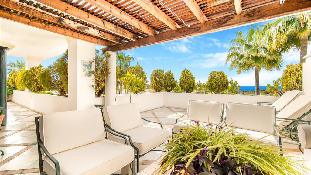 Exceptional south facing duplex penthouse in the exclusive community of Monte Paraiso on the Golden Mile with sea and pool views. One of the most sought after and exclusive urbanisations on the entire Costa del Sol, with 24 hour security, several outdoor swimming pools, a restaurant, children's play area, fully equipped gymnasium, steam room, sauna, squash court, massage room, indoor heated pool and tropical gardens that are maintained to the highest standards. In addition to all this, it is ju...