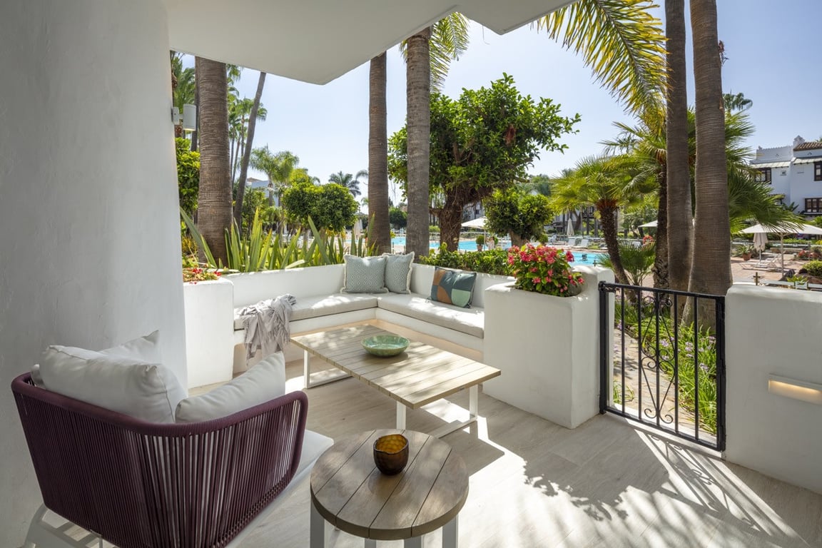 Nestled within the esteemed Puente Romano Resort on Marbella's illustrious Golden Mile,this is an exceptional modern apartment experience. This captivating ground- floor unit boasts a contemporary interior design that effortlessly combines aesthetics with functionality. The living space is open-plan, seamlessly integrating the living, dining and kitchen areas for a sense of flow and spaciousness. The kitchen, strategically designed in an L-shape, is fully equipped with cutting-edge appliances, o...