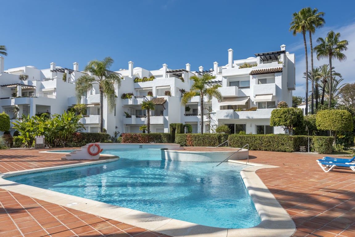 Charming apartment in one of the best beach locations in the center of Marbella. This exclusive beachfront community is one of the first of its kind, built in the 1980s, and is set in a private environment with stunning gardens, ponds, and bridges that lead directly to the promenade. The property is maintained in its original condition but offers enormous potential for renovation. Located on an elevated ground floor, it features a spacious terrace overlooking the gardens and pools, providing a ...