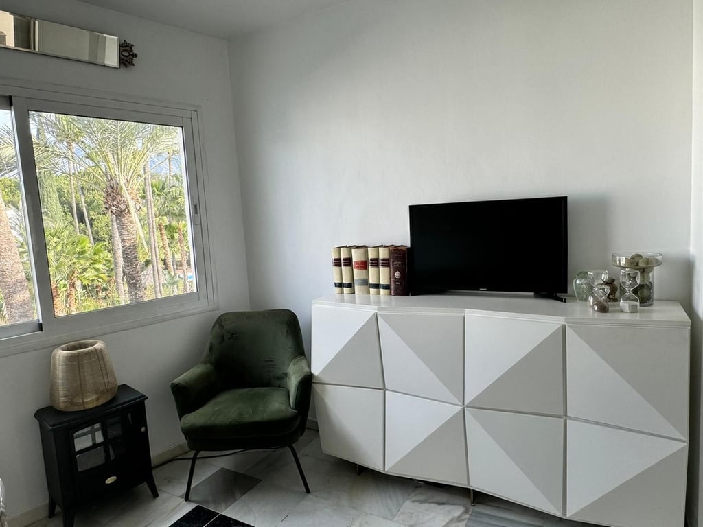 , Mijas Golf, Costa del Sol. 1 Bedroom, 1 Bathroom, Built 55 m2. Beautiful one bedroom apartment located in Mijas Golf, walking distance to the golf course, shops and restaurants. The apartment is in great condition and includes air conditioning and a double-parking space with storage room. Shared communal terrace. Fantastic Sub Tropical Gardens with ponds and Swimming Pool. short drive to the beach. parks and Riverside walks nearby. Viewings recommended. Setting : Frontline Golf, Close T...