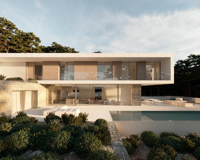 Villa for sale in Moraira Luxury new build villa distributed over 3 floors. The ground floor comprises: large bright open plan lounge-diner with open kitchen and access to the terrace, utility room, guest cloakroom and a bedroom with ensuite bathroom. Outside: large terrace, infinity pool and a barbecue area. On the upper floor there are 3 spacious bedrooms with ensuite bathrooms and access to a terrace with lovely views. The garage and parking are also on this level. There is also a basement ...