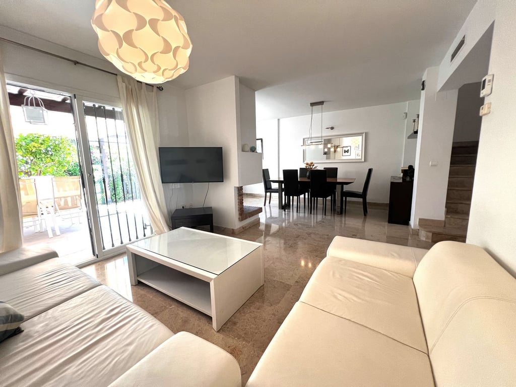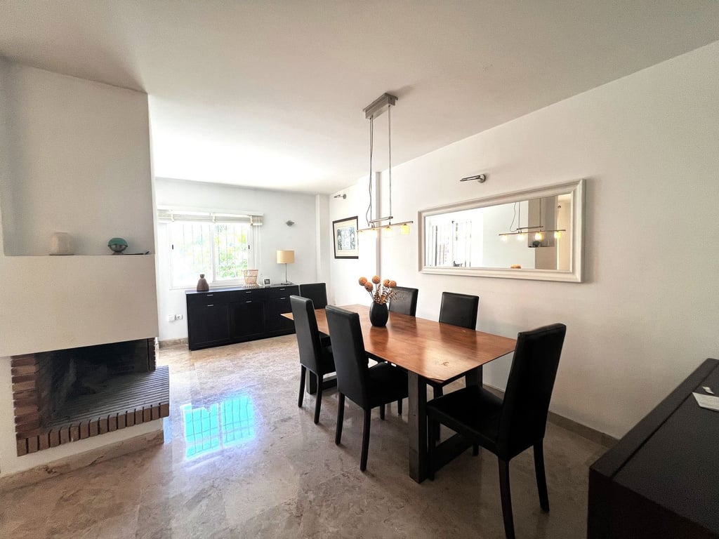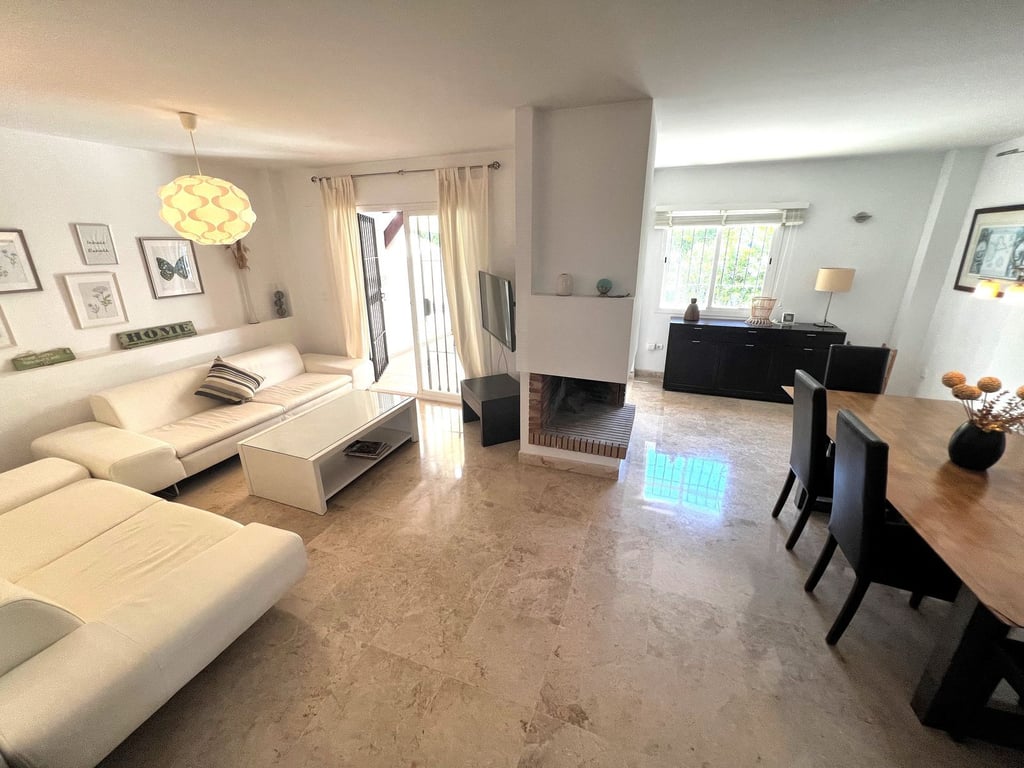 Stunning property in a super location convenient for walking to Aloha College, Puerto Banus, Dama de Noche Golf, local shops and restaurants. A very popular location for families and investors. This house has 4 bedrooms spread over 3 floors and is in a very good condition with a reformed new modern kitchen. At the front of the house you will find parking for a car behind an electric gate and a front terrace. The living accomodation is open plan with a feature fireplace in the living room sepe...