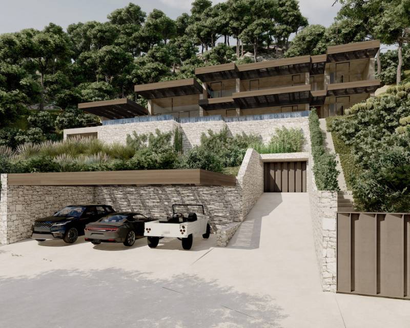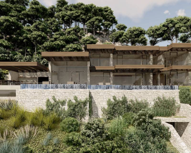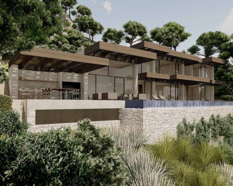 New build villa for sale in Raco de Galena Project for a designer villa with spectacular panoramic sea and mountain views, located in a very quiet area. The villa is distributed over 4 floors, all connected by interior stairs and lift. On the basement floor is a very spacious garage and a hall with access to stairs and lift. On the next level is a huge multi-purpose area. The ground floor comprises: bedroom with an ensuite bathroom, guest cloakroom and a spacious lounge-diner with a fully equip...