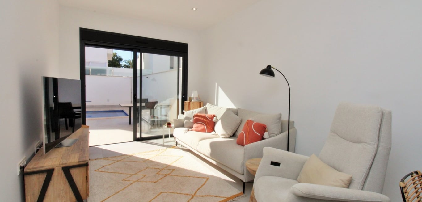This beautifully presented modern 2-bedroom townhouse, completed in 2022, is located in a quiet residential part of Pilar de la Horadada, just a short stroll from the town’s main square and all local amenities. Designed for comfort and easy maintenance, it offers fantastic outdoor areas and a high-quality contemporary finish throughout. The property is entered through double gates leading onto the front terrace, which also provides off-road parking. From here, an external staircase takes you up...