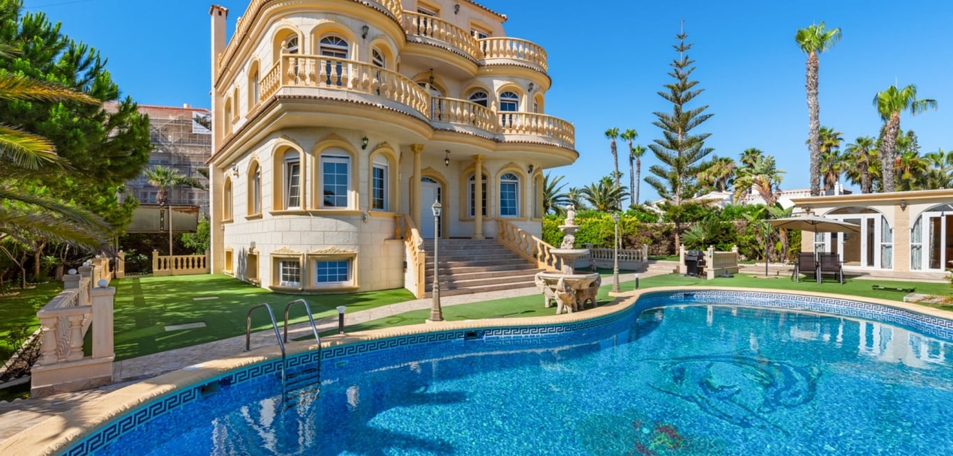This four-storey Luxury Mansion is located just fifty meters from the beautiful sandy beach of Playa Flamenca in a beautiful garden setting with a waterfall and a spacious 15 meter swimming pool. Beautiful Baroque style furnishings, marble floors, kitchen decorated with zirconium, bedrooms with alcoves - these details make this villa truly unforgettable, The total area of the house is 760 m2, including a living room with fireplace, a dining room, offices, six bedrooms (five of which have their o...