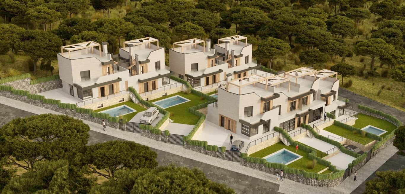 NEW BUILD SEMI-DETACHED VILLAS IN POLOP New Build modern townhouses and semi-detached villas with several terraces and solarium, totally fenced, with parking area for vehicles and private swimming pool in Polop. Modern properties with 3 spacious bedrooms with built-in wardrobes (the main one on the ground floor, with bathroom and dressing room en suite), 2 spacious bathrooms, large living-dining room with open kitchen, spacious terraces, large semi-basement with windows. Kitchen equipped with...