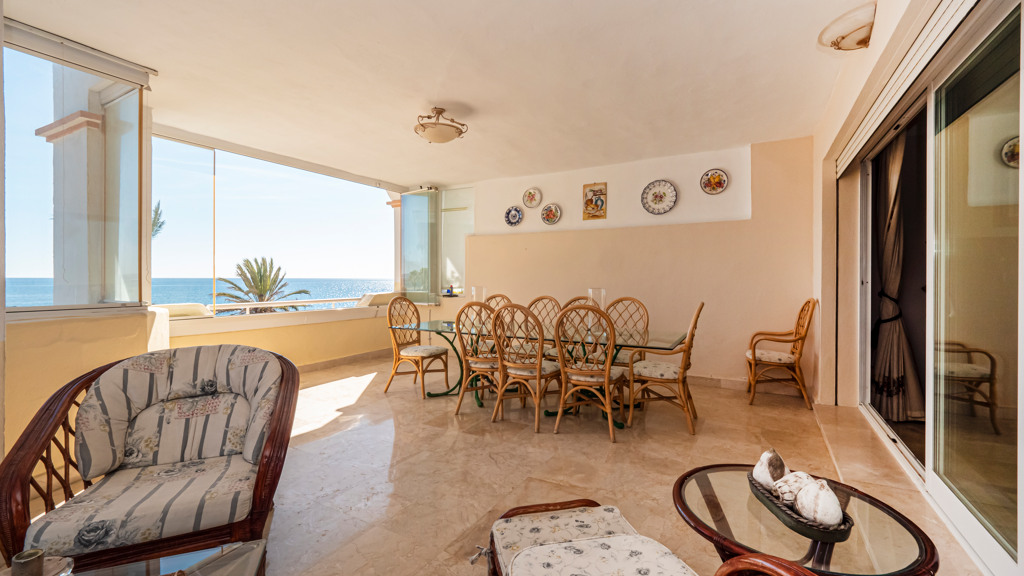 Fabulous flat with stunning sea views in a front line urbanization just a few minutes from Puerto Banus, situated in a privileged location. In addition, the community has direct access to the beach. This flat has a spacious living-dining room and fully fitted kitchen. Large terrace and bedrooms, the master bedroom with en suite bathroom. Garage and storage room included in the price.
