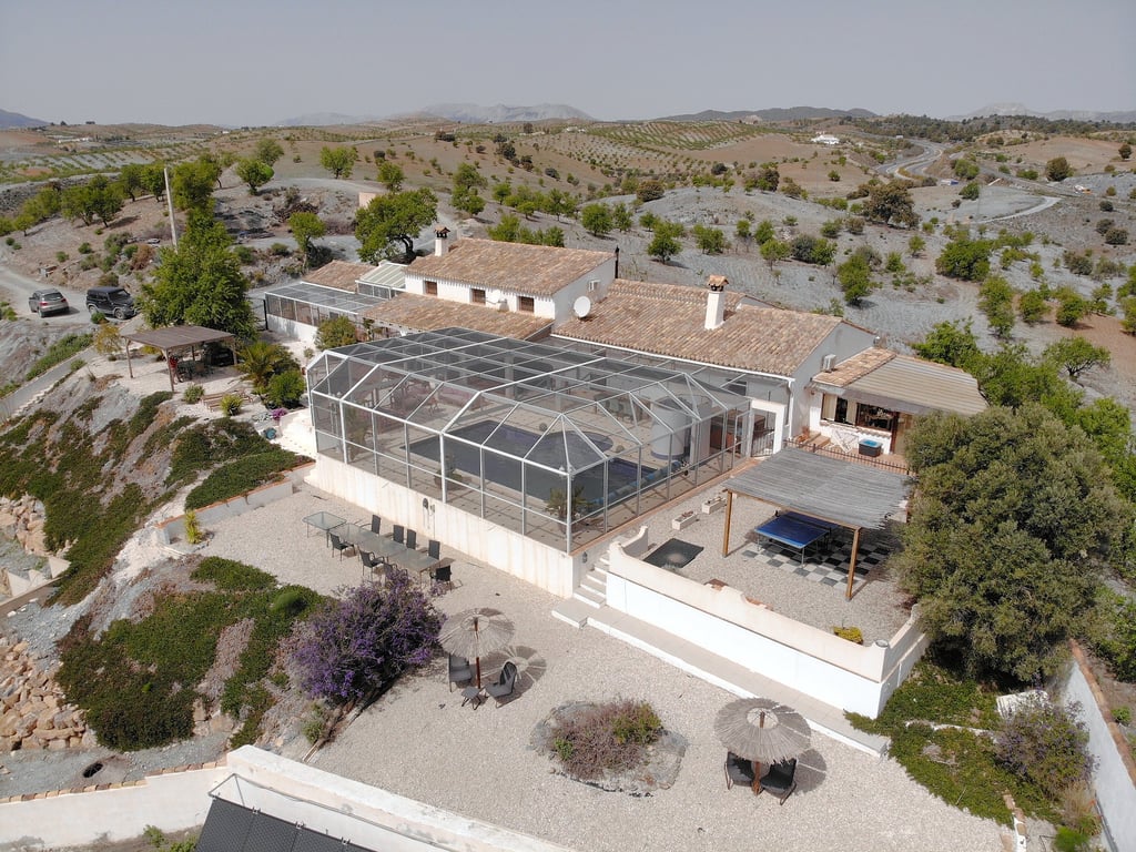 Stunning typical Andalucian cortijo/farm house, retaining many original Spanish features. 6 bed 6 bath in total offering 2 houses and 1 apartment, with one of the houses and the apartment being self-catering. Large fly-free terraced area enclosing a 10m x 5m swimming pool, a jacuzzi, and sitting and dining areas. Also a fully enclosed games room and other terraced areas. Surrounded by 20,842 m2 of natural land. Situated on an elevated position with superb and uninterrupted views across the roll...