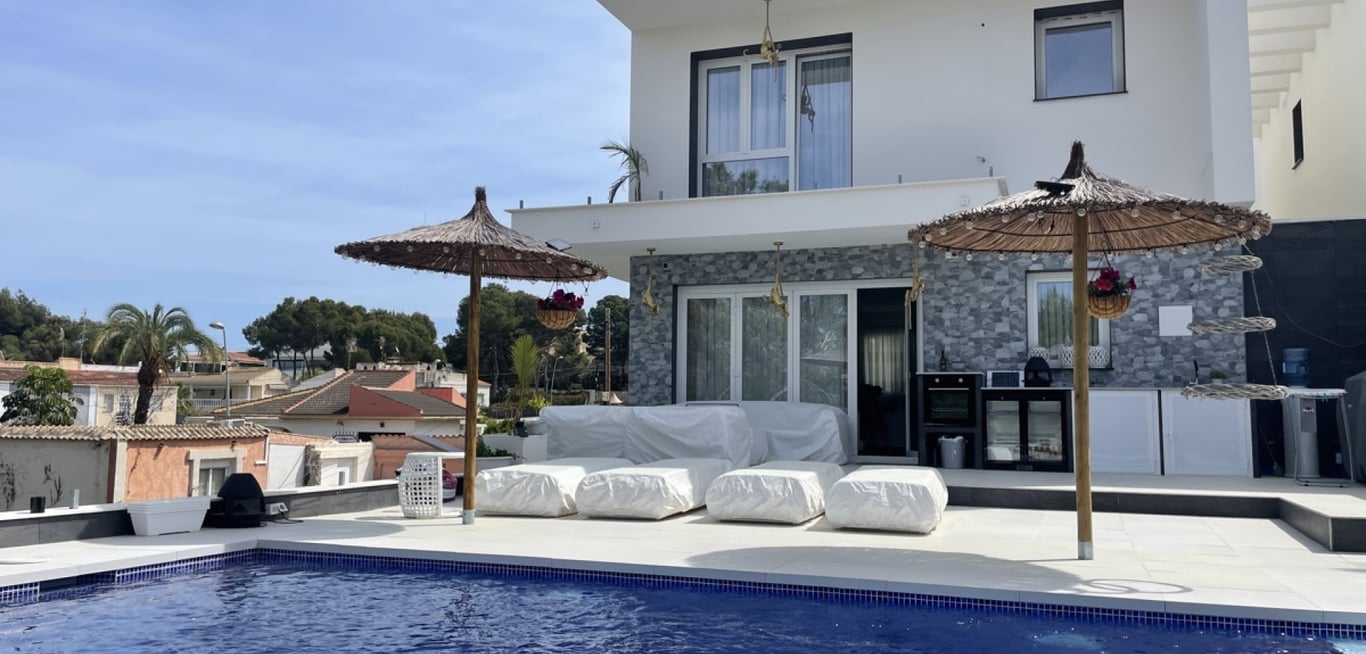 This Key Ready Villa is a must see property located in Los Balcones. Situated just a short walk from local amenities. Consisting of 2 bedrooms, 2 bathrooms as the main house, with a fully self contained 2 bedrooms, 2 bathrooms self contained apartment below. Finished to a very high standard, including Italian designed and manufactured kitchen and bathrooms, beautiful communal pool and spacious garden with off road parking. Oil filled central heating, air conditioning, multiple storage room...