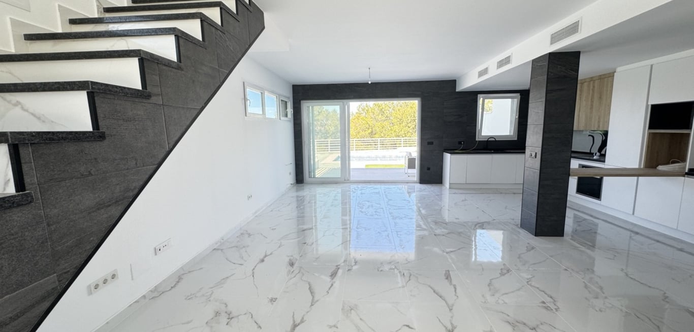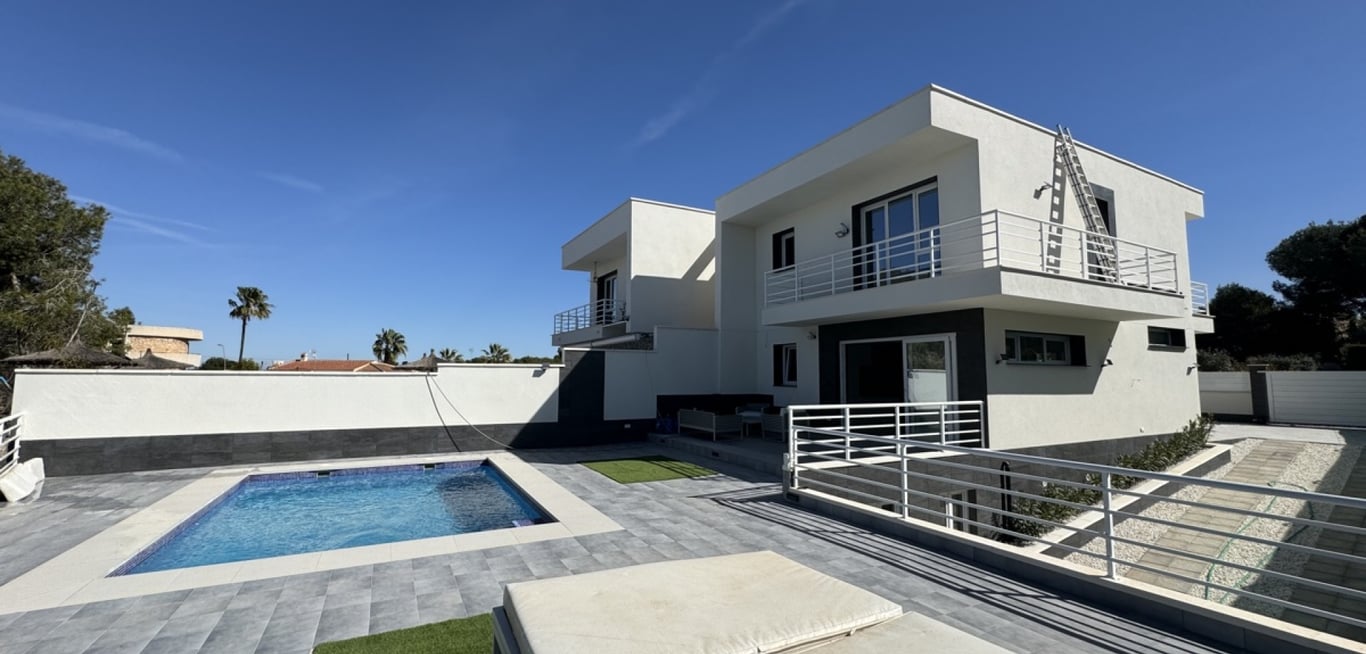 This impressive Villa is located in Los Balcones, Orihuela Costa. Offering 3 bedrooms, 2 bathrooms and WC, large open plan lounge with modern kitchen. On approach to the property you have a spacious front garden with long driveway leading down to a self contained apartment / possible office with separate garage. Large patio doors lead from the lounge out to the rear garden with terrace area, private pool and outdoor lounge/bathing area. Ideally situated this villa is within walking distanc...
