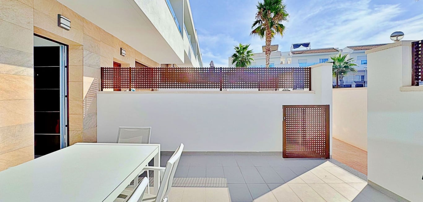 This three-bedroom, three-bathroom duplex townhouse is located in the exclusive residential area of Los Balcones in Torrevieja. The property stands out for its modern design, bright interiors and spacious terraces that allow you to enjoy the Mediterranean lifestyle all year round. On the ground floor, the house features a private 22 m2 garden with space for outdoor dining. Inside, there is an open-plan living room with an elegant feature wall, connected to a fully equipped modern kitchen with a...