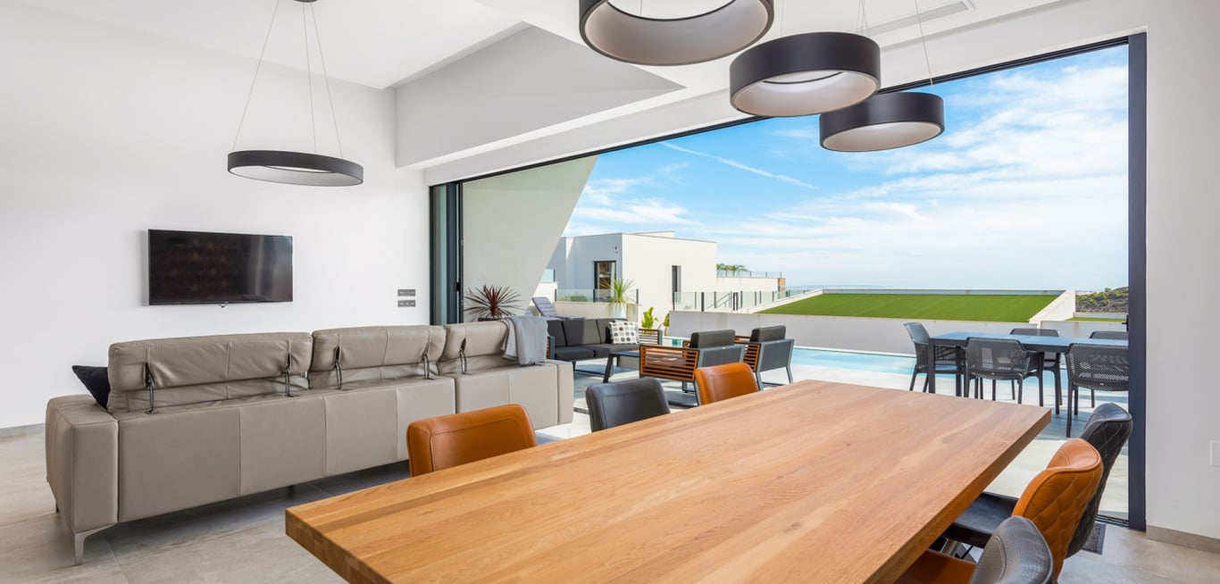 Luxury 5 bedroom / 6 bathroom villa with views in Ciudad Quesada. Beautiful luxury villa with a total living area of 333 m2 divided on two levels. It consists of a total of 5 double bedrooms, all of them with en-suite bathrooms, an additional bathroom and a guest toilet. The main floor consists of two bedrooms with en-suite bathrooms, a guest toilet, and a lovely open plan kitchen, living room and dining room. In the living area you have large sliding doors that opens up completely and gives...