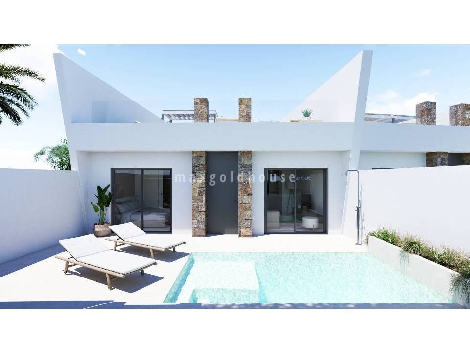 Are you looking for an affordable new build townhouse on one level in a typical Spanish village, but not too far away from the Medsea? Then this project in Roldan, only 15 minutes driving to Mar Menor, is something for you. The houses come with 2 bedrooms, 2 bathrooms, spacious and bright living / dining area and open kitchen. There is a good sized garden with private pool with pre-installation for heating pump and solar shower, and a solarium with summer kitchen. Included in the price are elect...