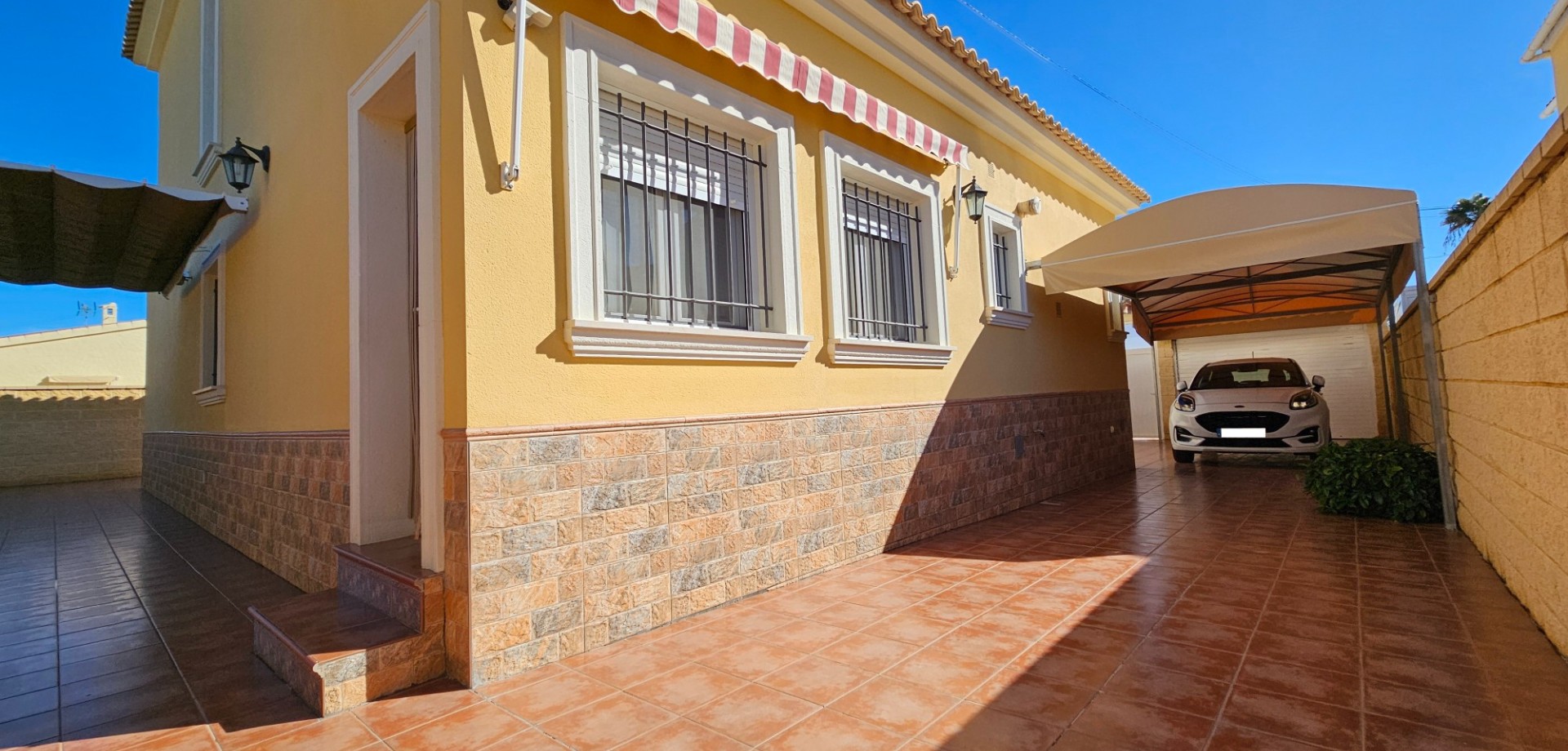 This well-maintained detached villa is located in the La Marina urbanization. The property sits on a 316 m2 plot, which includes a double covered parking space, an uncovered parking space, a large outdoor kitchen with all necessary appliances, a 6 x 4 meter swimming pool, a separate toilet, storage space, and ample terrace space. The garden is fully tiled and therefore maintenance-free. The property itself consists of two floors. On the ground floor, we find a spacious living/dining area, next t...
