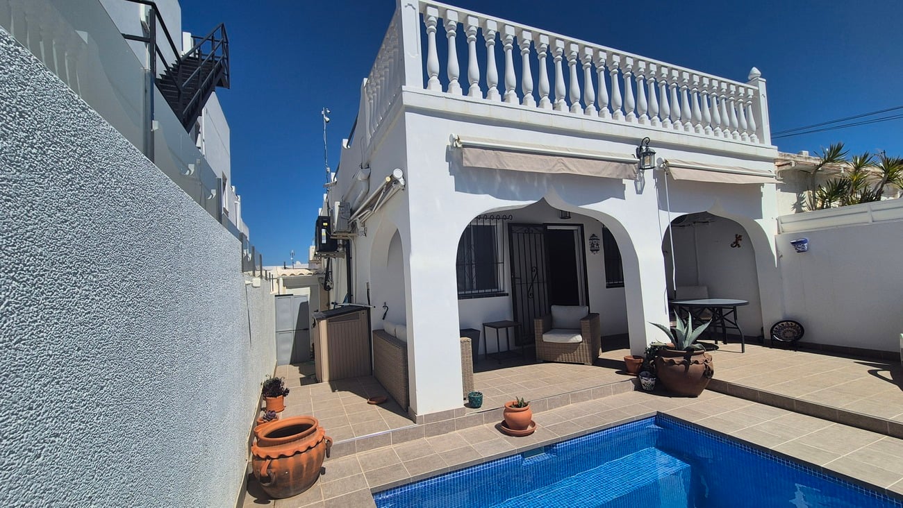 We present you with this impressive 2 bedroom, single-story bungalow, with roof solarium and impressive heated saltwater pool, complemented by solar panels to enhance energy efficiency. Conveniently situated, it is a mere 8 minutes from the bustling Villamartin - 10 minutes to the La Zenia Boulevard area, Beaches, Golf courses, and the popular Zoco Market. The owner has renovated the property over the last two years. The renovation includes:New Metal Fencing to the boundary of the propertyNe...
