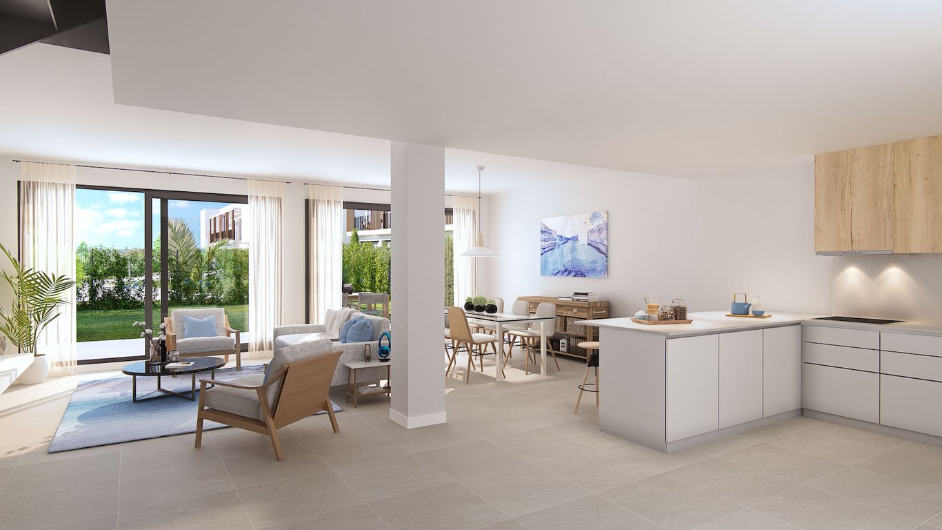 The complex has 32 spacious 4-bedroom townhouses with different interior layout options, modern design, open-plan rooms with large terraces and solariums in some homes. Parking for two spaces on the surface. It is located on the first line of golf and the homes have a double N-S orientation. Gardened common areas and swimming pool with rest area as well as a parking area for buggies. The kitchens are furnished and equipped. Possibility, depending on the degree of execution of the works, to cus...