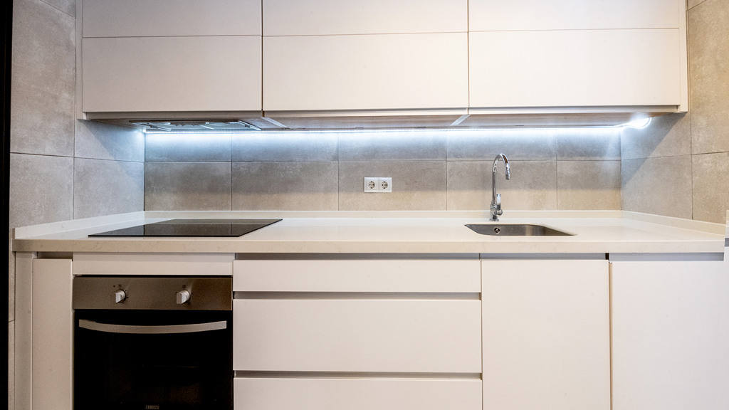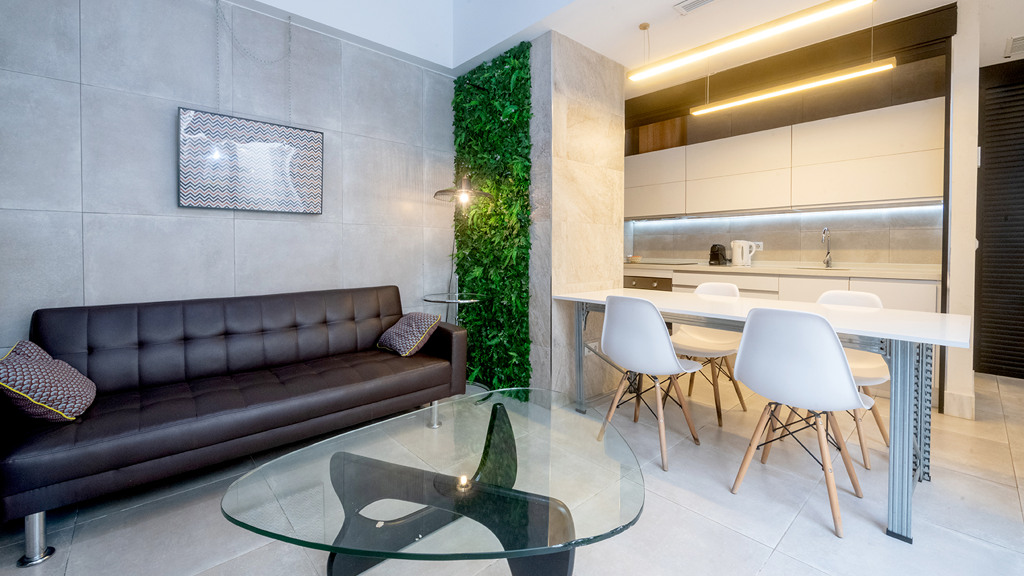 GILMAR presents an exclusive modern holiday flat in Seville's vibrant Nervión neighbourhood with 54 square metres of living space. The completely refurbished interior radiates modern style and elegance, with an open concept kitchen equipped with state-of-the-art appliances that joins the dining area and a spacious living room. From the lounge there is a terrace with a small swimming pool and shower. It offers good qualities such as porcelain tiling on floors and walls, stucco, sliding doors and ...