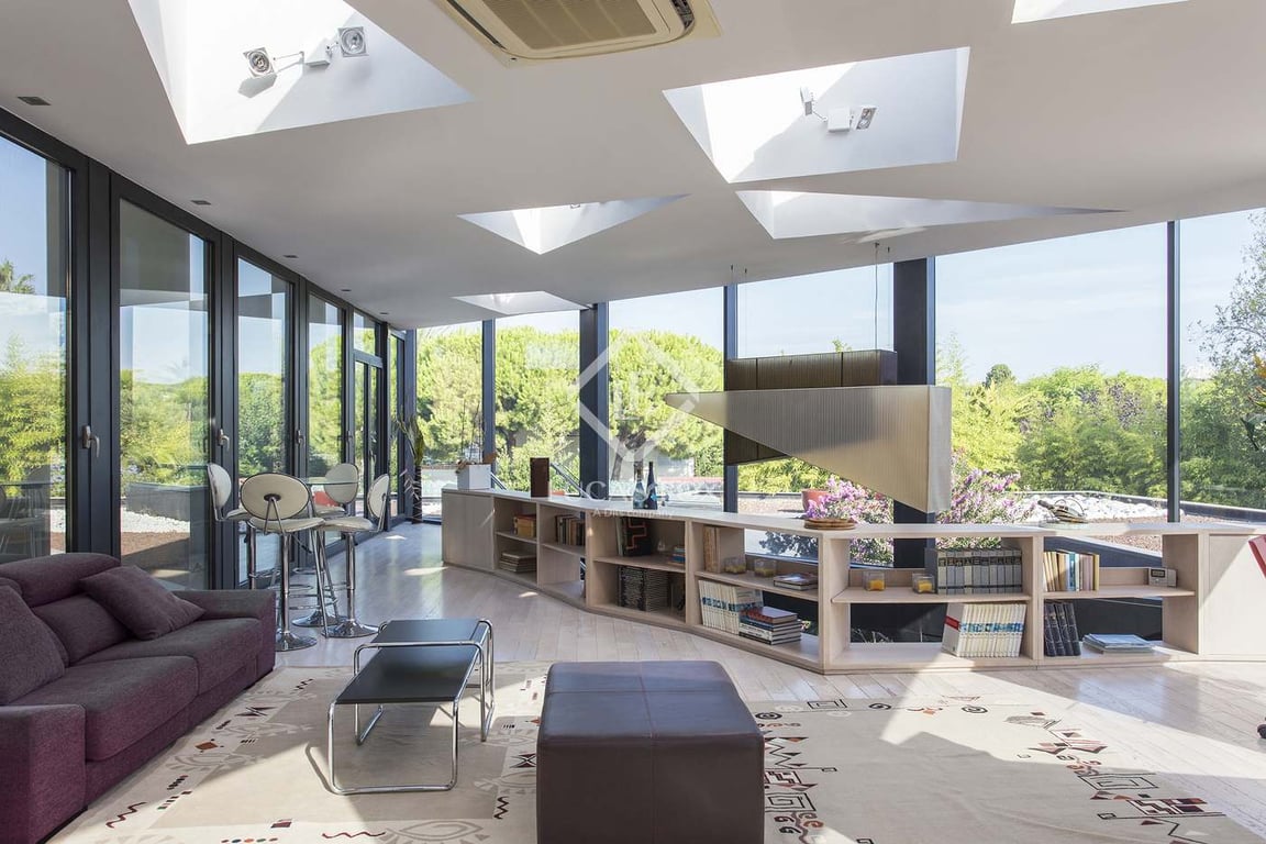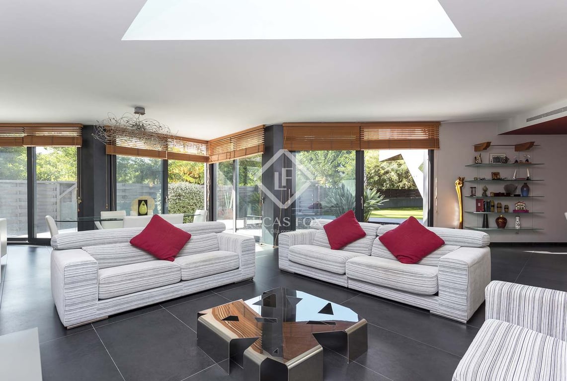 Set in quiet seclusion but just a couple of blocks from the amazing beaches of Sitges, this striking luxury villa has a unique design and a real wow factor, with sweeping living spaces and every modern comfort. It combines the best of modern living with easy access to both a beach lifestyle and relaxing in your own private outdoor space. The sleek gardens offer tranquillity and versatility, with a stunning triangular pool and a jacuzzi, barbecue, porch, large open lawn area, trees and plenty o...