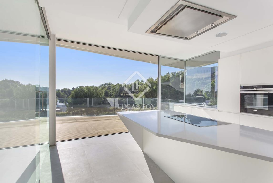 We enter this exquisite property by steps leading up to the front door from the street level, or alternatively from the garage via the lift. The large light filled entrance hall has a guest toilet to the left as well as a guest bedroom with its own en-suite bathroom. To the right we access the kitchen with its fitted contemporary white cupboards and built-in Siemens appliances and which boasts an impressive central island. The kitchen is linked to the living area by a large glass sliding door,...