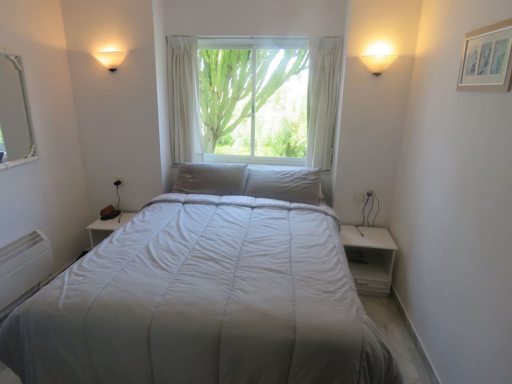 This cosy 2 bedroom, 2 bathroom apartment is located in a quiet and beautiful urbanization in Calahonda. This elevated ground floor looks out over a lovely green area and "Arroyo". There is small kitchen, dining area and sunny living room. The apartment need some updating but that is reflected in the price. Not much out there for this money anymore. The urbanization has a beautiful pool area.