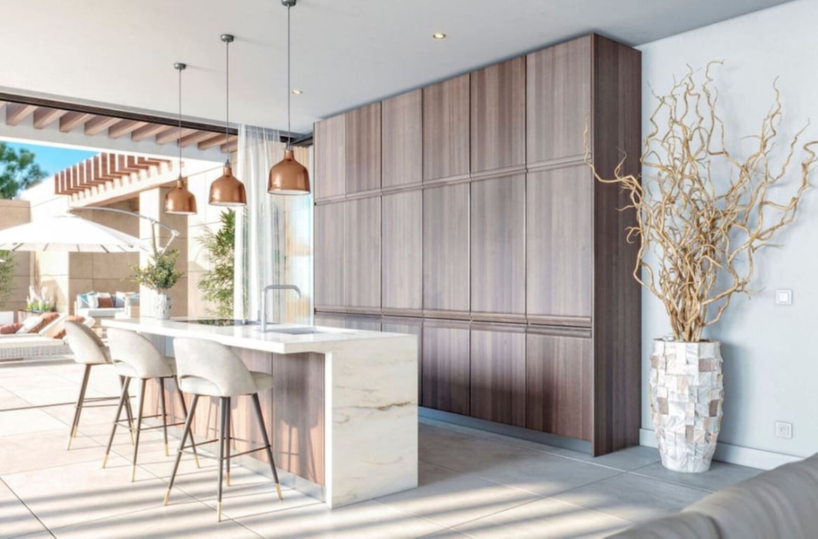 This contemporary frontline golf villa combines clean architectural lines with warm natural finishes, creating a refined yet welcoming modern home designed for relaxed luxury living. Arranged across two levels, the layout focuses on seamless indoor-outdoor flow, with generous open-plan living and dining areas connected to expansive covered and open terraces through full-height glazing. The modern kitchen is fully integrated, ideal for both everyday living and entertaining. The main sleeping acco...