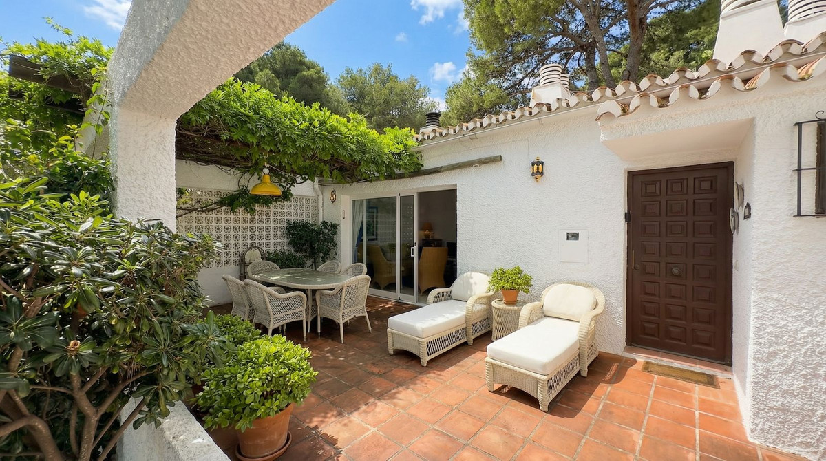This typical Andalusian townhouse offers a comfortable and welcoming layout with 2 bedrooms, 1 bathroom plus a separate guest toilet, a bright living room with fireplace, and an open-plan kitchen. There is central heating (gas) and airco in living and bedrooms. Both bedrooms feature built-in wardrobes and their own washbasin, a practical and traditional detail. From the private terrace you can enjoy open views over the communal garden with mature trees, providing a peaceful and green setting. ...