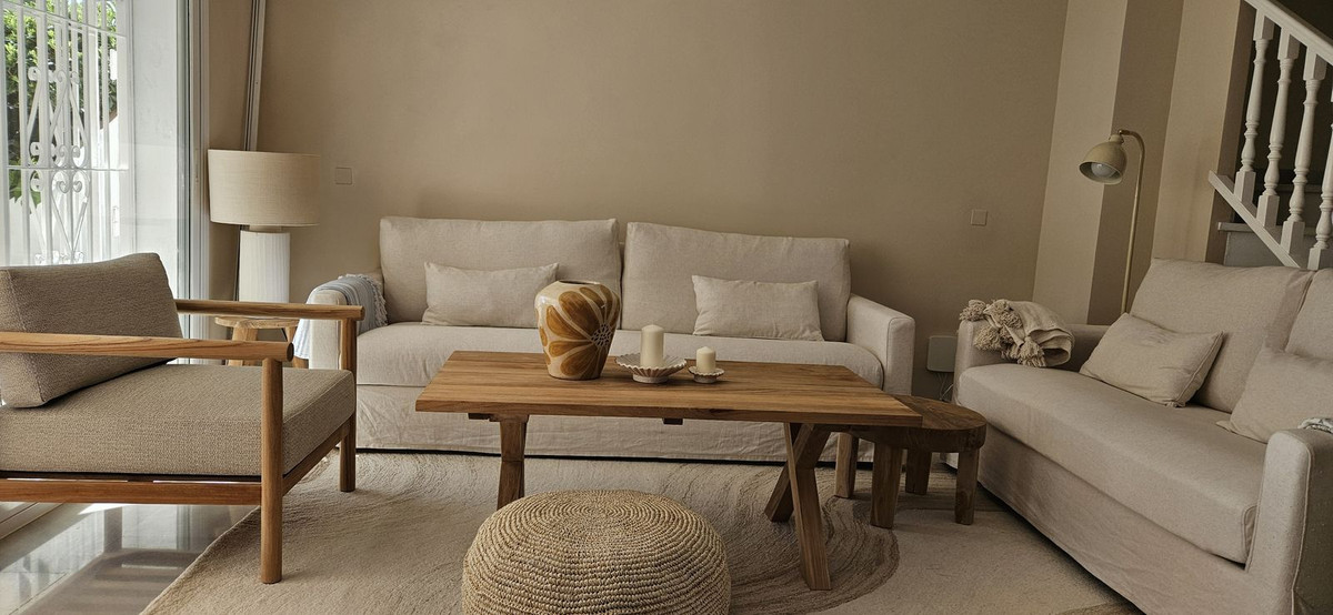 Elegant and charmingTownhouse with Open Views in Calahonda Set within the highly sought-after urbanisation of La Cornisa, this beautifully renovated townhouse offers an effortless blend of style, tranquillity, and Mediterranean charm—surrounded by lush greenery and a lovely sense of openness. The entrance level welcomes you into a refined open-plan living space, where a newly renovated kitchen flows seamlessly into the lounge. The interior is thoughtfully curated in a sophisticated bohemian styl...
