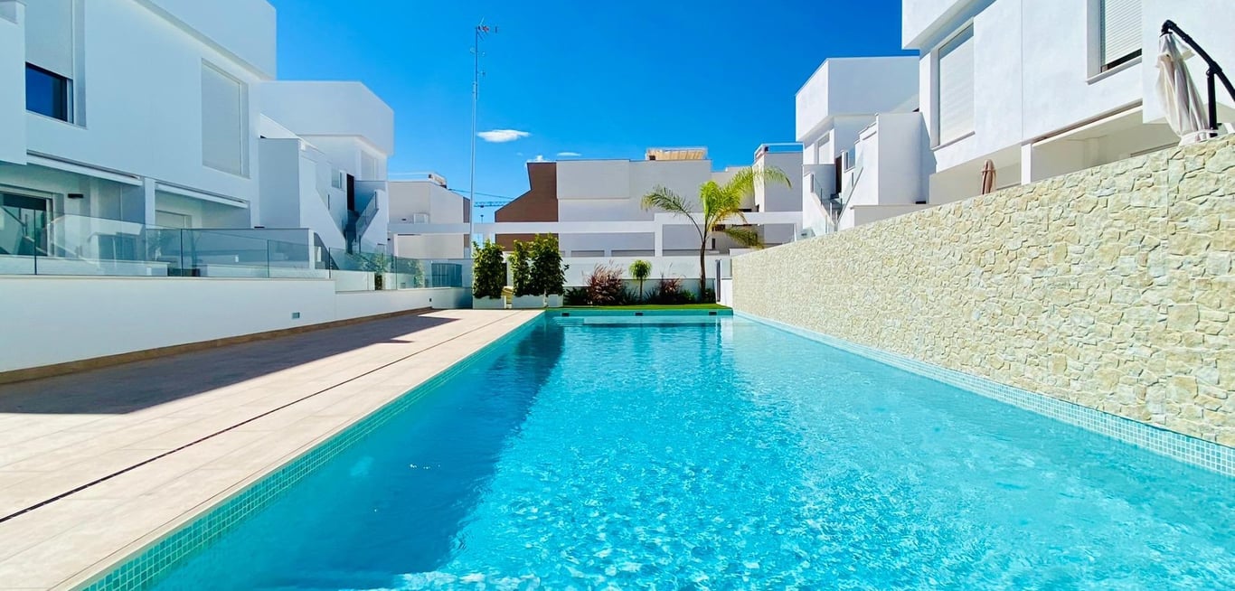 New Build Bungalow Residential Complex in Pilar de la Horadada Exclusive Modern Bungalows in Pilar de la Horadada This new development offers 16 stylish bungalows in the desirable town of Pilar de la Horadada, located in the southernmost part of Costa Blanca. Choose between 2 or 3-bedroom options, each featuring 2 bathrooms. Ground-floor units come with spacious front and rear terraces, providing direct access to the communal pool and garden, while top-floor units boast a large private rooftop ...