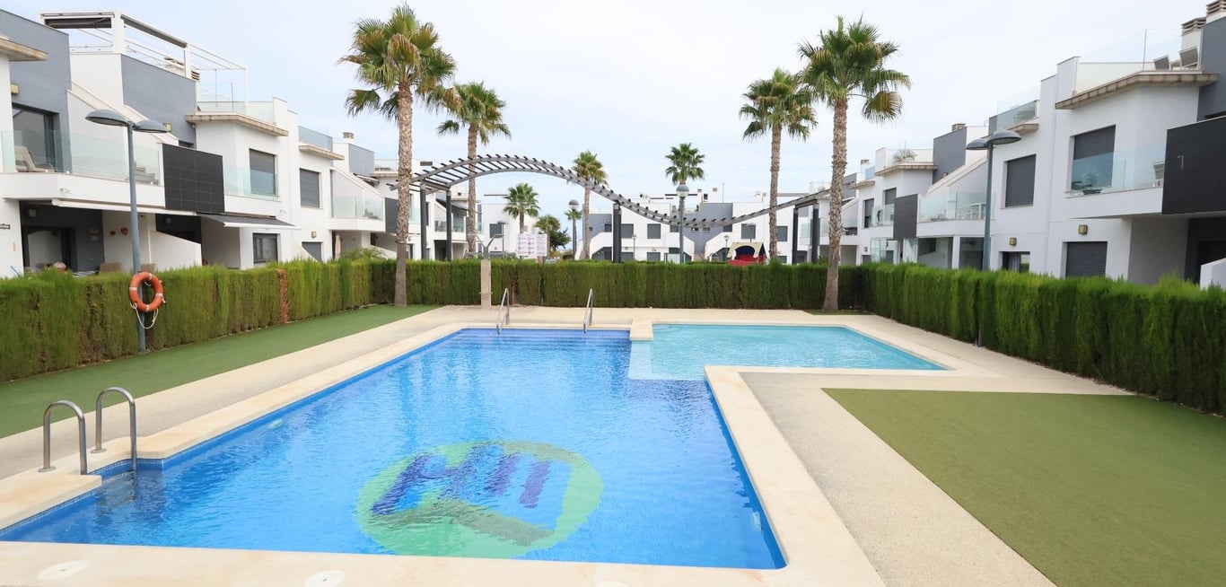 Pilar de la Horadada Top-Floor Bungalow in Residencial Lamar Resort. . Bright, south-facing 70 m2 bungalow located in a modern, gated community. The home features 2 bedrooms, 2 full bathrooms, an open-plan kitchen, a living-dining room, a terrace, and a large private sun terrace ideal for enjoying the sun year-round.. . The complex offers 2 large communal pools, a children's area, and a parking space included.. Sold fully furnished and equipped with air conditioning.. Perfect both as a holiday h...