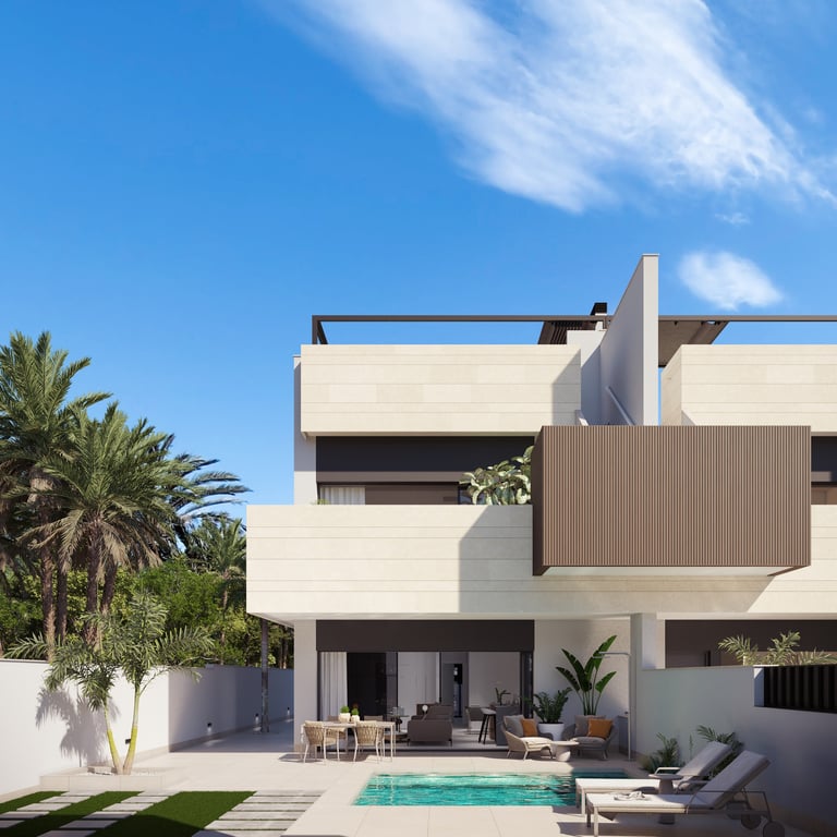 Located in the charming town of Pilar de la Horadada, this exclusive residential complex offers nine unique properties. The typology options include independent homes, high-bungalows, and low-bungalows, each designed to provide maximum comfort and functionality. The location is ideal for those seeking a tranquil environment near the sea, as it is just 2 km from the coast. Additionally, the nearest airport is 40 km away, facilitating access for frequent travelers.OUTDOOR AREASThe properties featu...