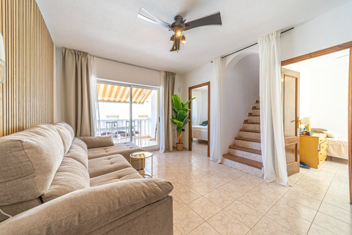 Duplex penthouse with large terrace and sunny solarium. Beautiful duplex penthouse located in a quiet residential complex with a communal pool. The property offers 3 bedrooms, 1 bathroom, a private kitchen, and a bright living room with access to a private terrace. The upper floor features an additional bedroom and a spacious sunny solarium with barbecue and panoramic city views. The apartment has new air conditioning, is sold furnished, and is ready to move in. Key features: 3 bedro...
