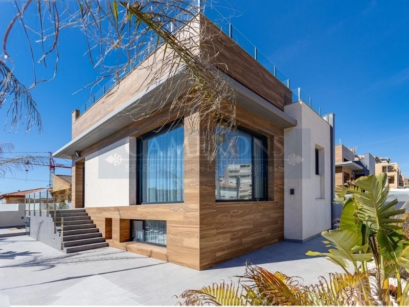 Detached villas located only 100m from the La Mata beach in Torrevieja, on the Costa Blanca South. Within walking distance of supermarkets, cafés and restaurants, and a short drive to Torrevieja centre and the Habaneras shopping centre.These modern 4 bedroomed villas have a unique design, with an elevated main floor comprising a bright lounge, dining area and kitchen. Also on this level is an en-suite bedroom and guest toilet. There is a terrace off the main entrance, overlooking the garden and ...