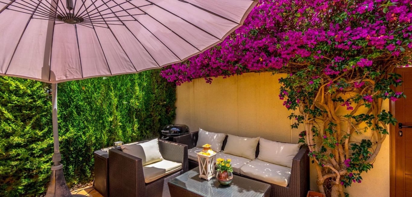 This stunning two-storey townhouse combines privacy, comfort, and contemporary design in a fully renovated home decorated with exceptional taste. It features three spacious bedrooms with fitted wardrobes and two modern bathrooms, offering a functional and elegant living space. The fully equipped kitchen connects seamlessly to a bright and stylish living room furnished with high-quality pieces, including two leather sofas. Enjoy exceptional outdoor areas: a 43 m2 front terrace with rattan g...