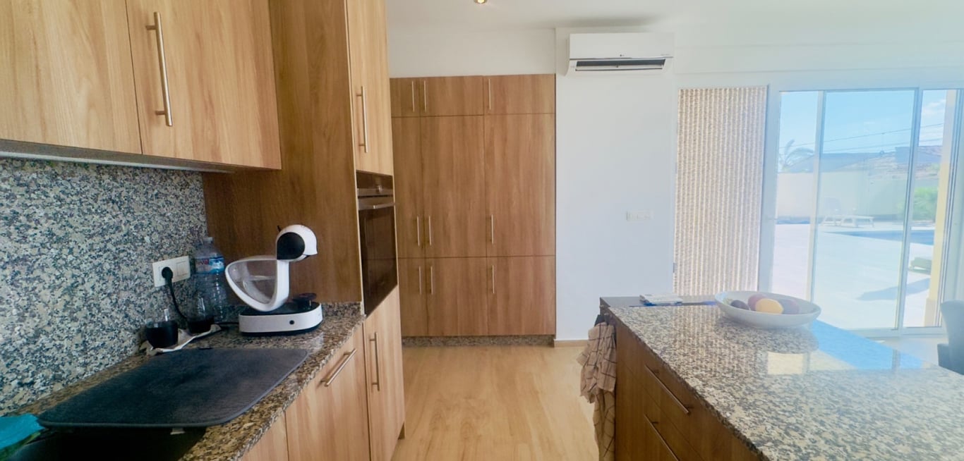 This stylish single-storey villa offers modern living on an 800m2 south-facing plot, just two minutes from the famous pink salt lakes. With three spacious bedrooms and the potential to add a fourth in a separate outer building, this property adapts easily to your needs. Enjoy two well-appointed bathrooms, with space for an additional one in the external structure. The villa includes a separate storage and laundry room, outdoor shower, and a private five-person jacuzzi—perfect for relax...