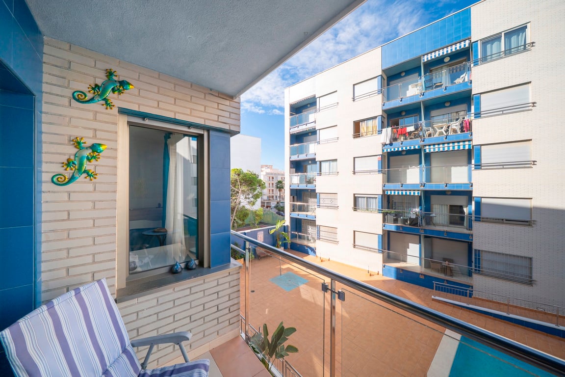 2 bedroom apartment located in a first line residential complex in Playa de los Locos in Torrevieja. The apartment consists of two bedrooms with fitted wardrobes, one bathroom, an open plan kitchen, living and dinig room, and a utility room with access from the kitchen. From the living room you have access to a terrace overlooking the communal areas. The apartment is located in the third floor with elevator. In the residential complex there is a communal swimming pool with a ti...