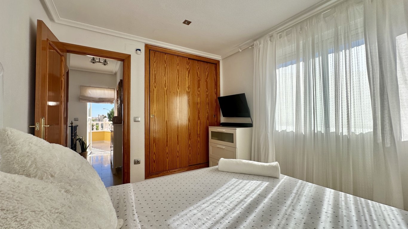 This beautiful two-storey semi-detached villa offers 167 m2 built and 116 m2 of interior living space, located in a peaceful and secure residential complex with a community pool and green areas. The home features 3 spacious bedrooms, 2 bathrooms, an independent fully equipped kitchen, and a bright living room with air conditioning. It also includes 4 private terraces, perfect for outdoor dining, relaxation, or sunbathing. Located in one of Orihuela Costa’s most sought-after areas: 6 minutes to t...