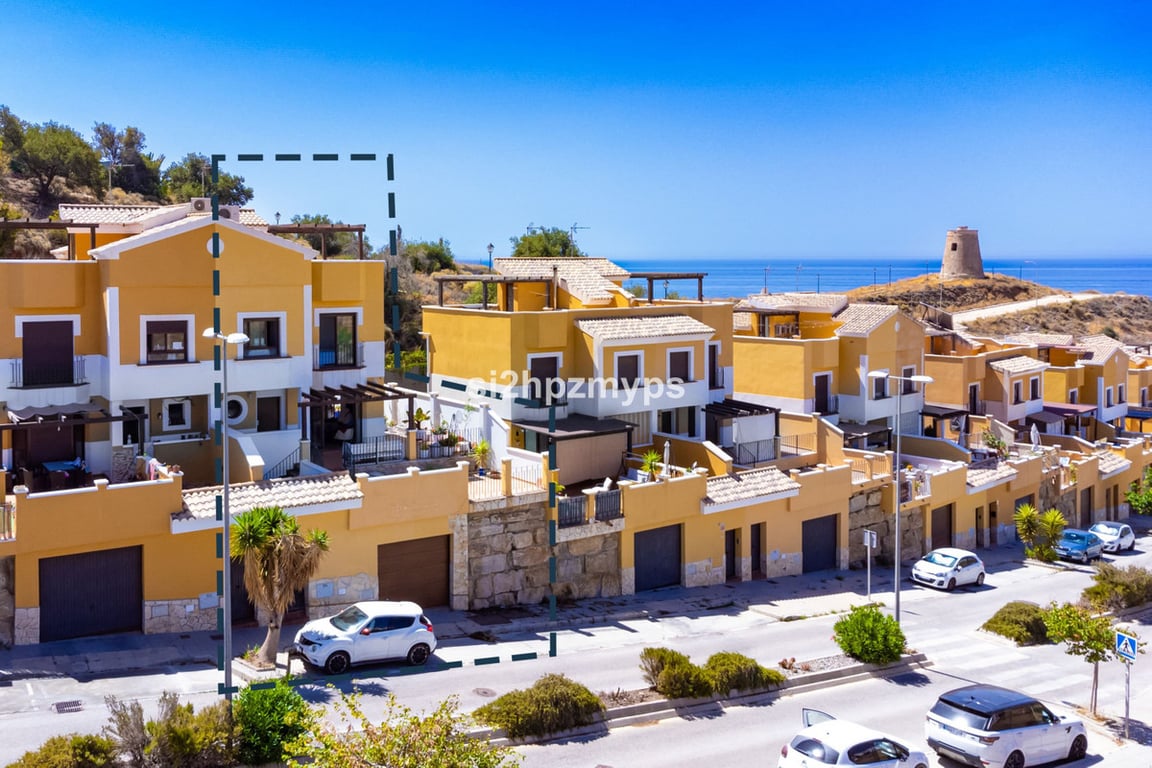 Semi-detached house in Lagos with private pool and garage, only 400 from the sea Welcome to this lovely semi-detached house that has everything you need; a private garage with workshop, lovely patios with views, private pool and a roof terrace! The urbanization Castillo de Lagos is located only 400 meters from the sea in a quiet and private environment between Torrox Costa and Lagos. The house has 3 floors distributed as follows: - A garage with space for two cars, a toilet and a workshop, curr...