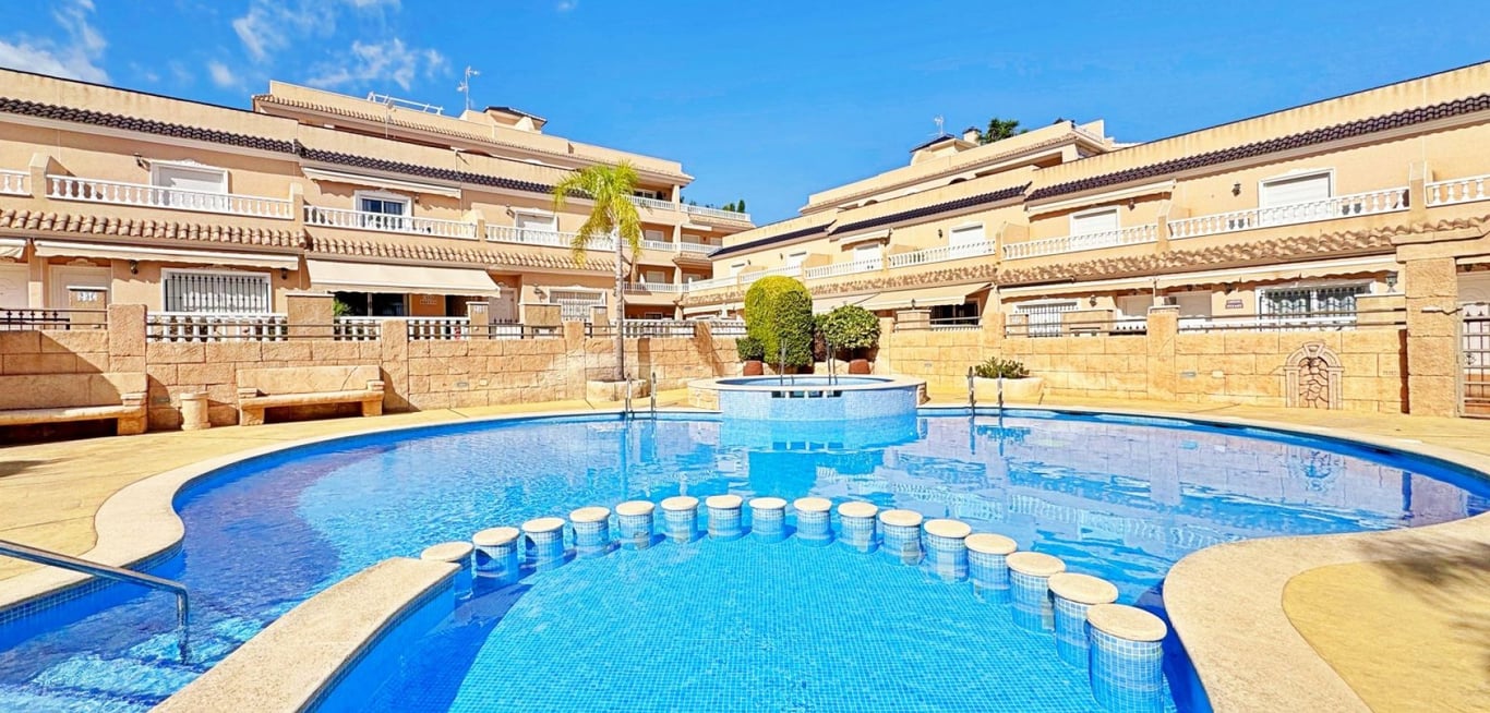 Beautiful corner quad-style duplex located in the exclusive Vista Azul Residential, one of the most desirable developments in Villamartin, Orihuela Costa. This home perfectly combines Mediterranean style, comfort and an excellent location within a quiet, family-friendly environment close to all essential amenities. With 90 m2 of built area on a 120 m2 plot, the property enjoys a southwest orientation, providing plenty of natural light all day long. The ground floor offers a bright living-dini...