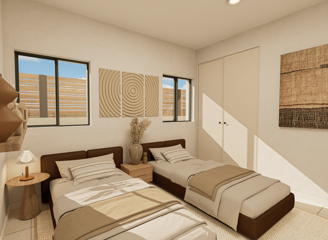 A new development of different styles of properties, this semi detached villa is all on one level and has a large sun terrace, the villa has two bedrooms and two bathrooms and is located in a quiet Spanish village which is close to the fabulous beaches and coast line of Mazarron.