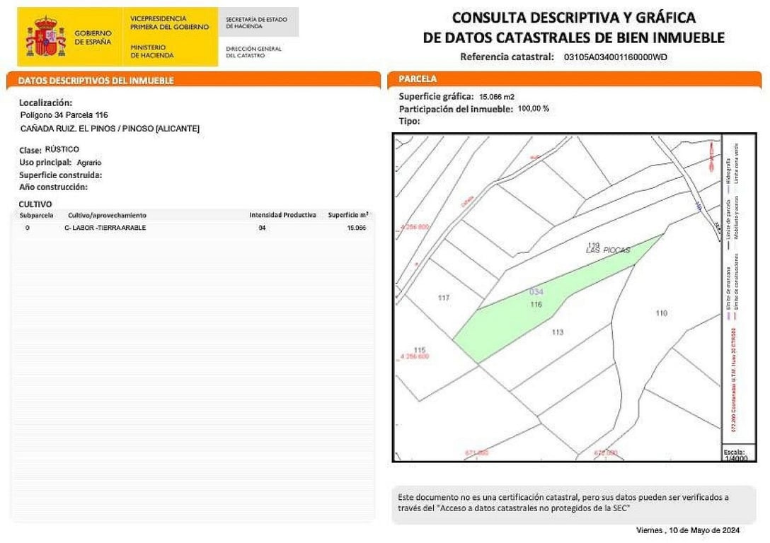 15,000m2 of land in Pinoso with electricity onsite and drinking water close. Plot of land near Lel, 15,000m2 with electric point on the land, and with drinking water close.