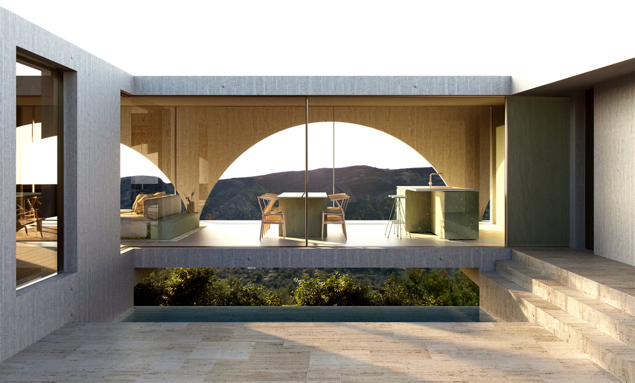 Unique design villa, on a south facing plotFully licenced and approved project (over 1100 pages)With a modern design and concept to warm in the winter and cool in the summer with the sun position.A high class villa with arches that is distinctive and futuristic.If you want a dream house, you can start today.The finishings are white concrete with a marble floor external area.Floor plan and project on request.