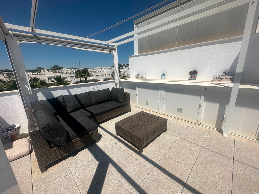 Vistabella Golf Modern Penthouse 2 bed 2bath for sale with private roof top solarium & communal swimming pool located close to town centre & golf course >>>>>>>>>>>>>>>>>>>>>>> New listing ! Superb top floor apartment in the sought after Vistabella golf complex Residencial Capri 4. The apartment consists of an open plan living space with kitchen, 2 double bedrooms , 2 bathrooms (master en suite) , west facing terrace overlooking the landscaped gardens and a sun drenched solarium with awnings and...