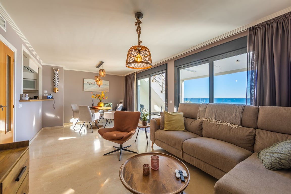 Magnificent penthouse with a large terrace and southeast-facing solarium, enjoying wonderful views of the sea and the golf course. Located in a beautiful residential complex, it sits in one of the most sought-after areas, surrounded by prestigious golf courses, in a peaceful setting away from noise. Just a 5-minute drive away, you'll find the attractive beaches of Casares Costa, the charming village of Sabinillas, and the lively Puerto de la Duquesa, where you can enjoy all kinds of shops, resta...