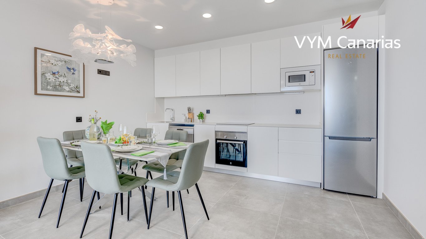 VYM Canarias real estate agency offers for exclusive sale a luxurious apartment in the newly built complex ‘Terrazas de Costa Adeje’, El Madroñal. This bright apartment is located on the top floor of a three-storey complex and has beautiful ocean views. The property consists of an entrance hall, open-plan kitchen and spacious living room, two bathrooms, three bedrooms with fitted wardrobes and access to the terrace. The apartment is fully furnished, with air conditioning and an alarm system. The...
