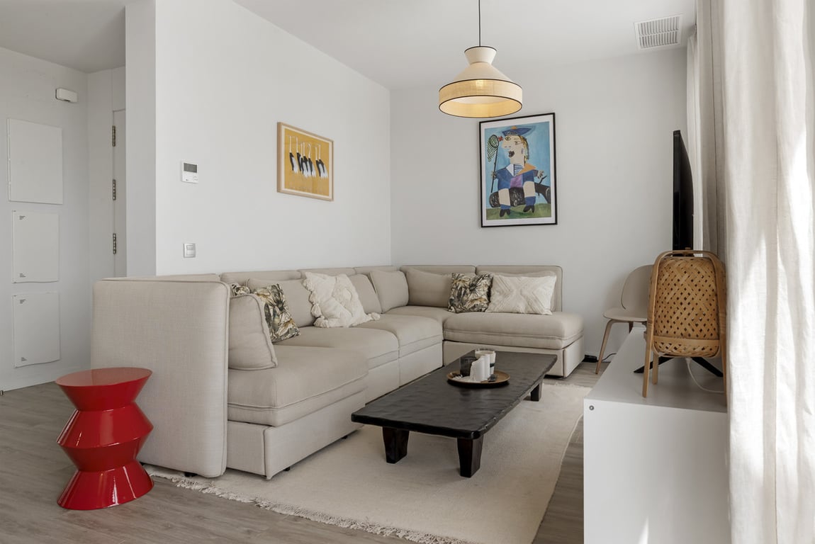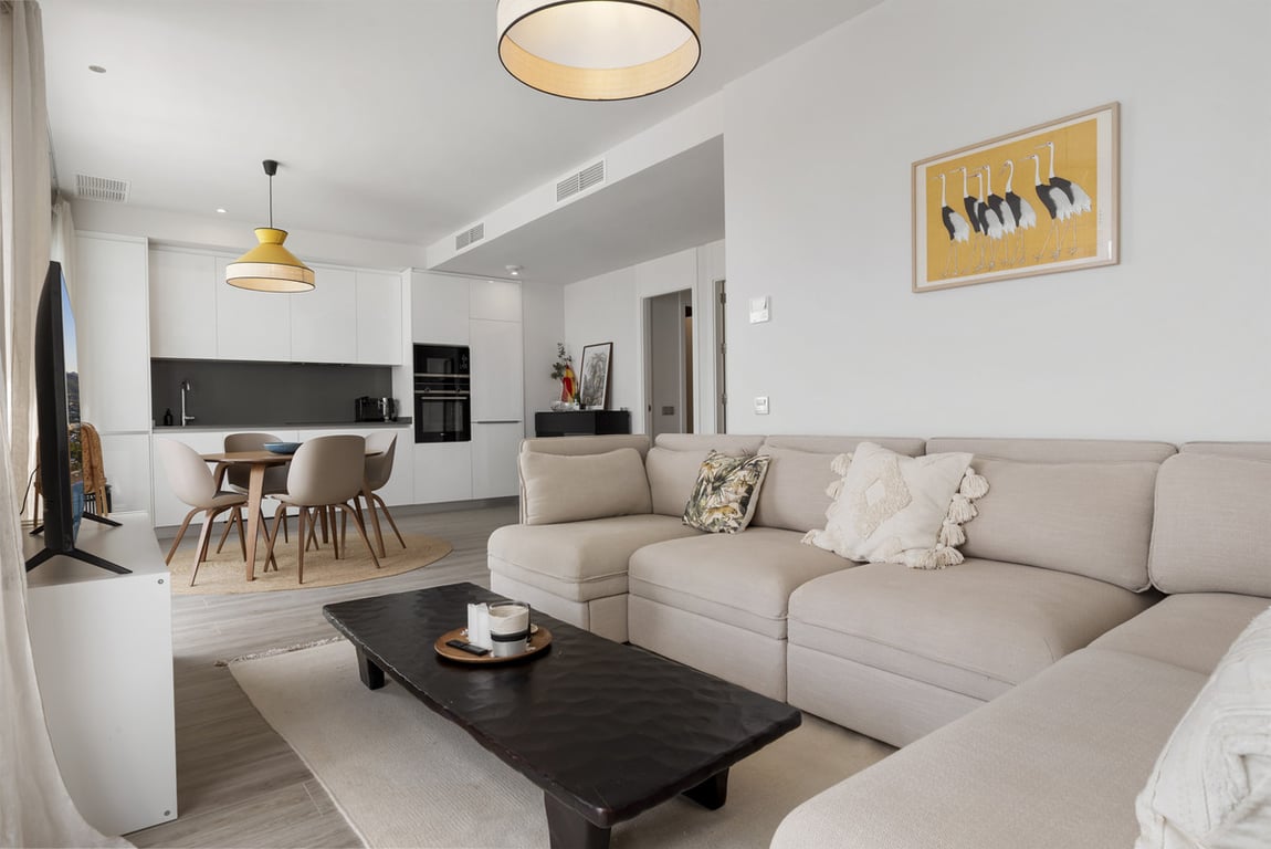 Located in the sought-after Le Mirage Phase III on the New Golden Mile, this stylish 2-bedroom, 2-bathroom corner penthouse offers a perfect combination of modern comfort and prime location. The bright open-plan living and dining area features floor-to-ceiling sliding glass doors that lead to a spacious terrace, filling the home with natural light and framing spectacular views of the sea, mountains, and evening sunsets. The fully fitted kitchen comes with high-quality Siemens appliances, and bot...