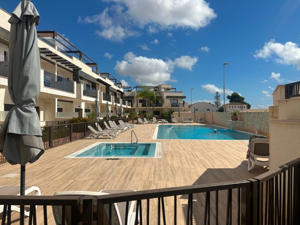 Dolores de Pacheco Modern 2 bed 2 bath penthouse apartment for sale with private roof top solarium in the village close to amenities and to Roda Golf resort. Modern 2 bed 2 bath Penthouse with open plan living and a terrace from the lounge area and a private roof solarium. The master bed is en suite, and both bedrooms have fitted wardrobes there is a guest bathroom to. The living area is open plan and flows from the kitchen to the south facing terrace. A small community with pool and gardens. I...