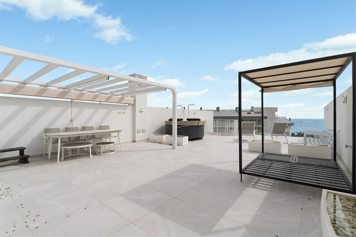 The property has a modern style and offers two bedrooms and two bathrooms, one of which is en-suite. The open kitchen and living room create a spacious and inviting atmosphere. Through the sliding doors, we access a southwest-facing terrace of 22 sqm with an impressive view of the Mediterranean Sea. Additionally, there is a rooftop terrace of 107 sqm with an installed jacuzzi, perfect for relaxation. The community features a shared pool area where you can enjoy sunny days and refreshing dips. Th...