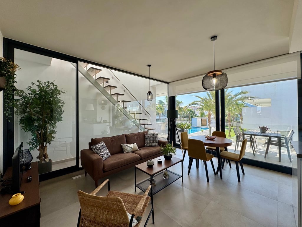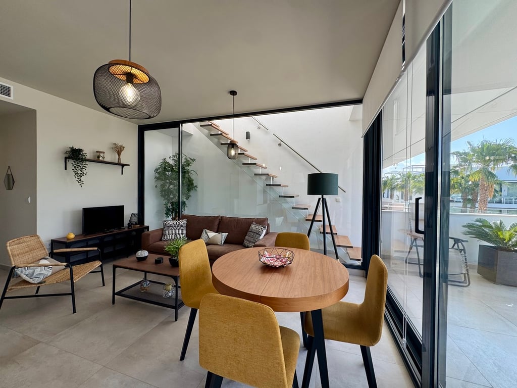 A recently built penthouse apartment located on the first floor of an exclusive residential complex in Mar de Cristal. The property features a private solarium with views of the Mar Menor, set within a beautifully maintained development offering expansive landscaped gardens and a communal swimming pool.This modern, all-exterior home stands out for its high-quality finishes, abundant natural light, and a sense of privacy within a peaceful environment surrounded by green spaces.The property boasts...