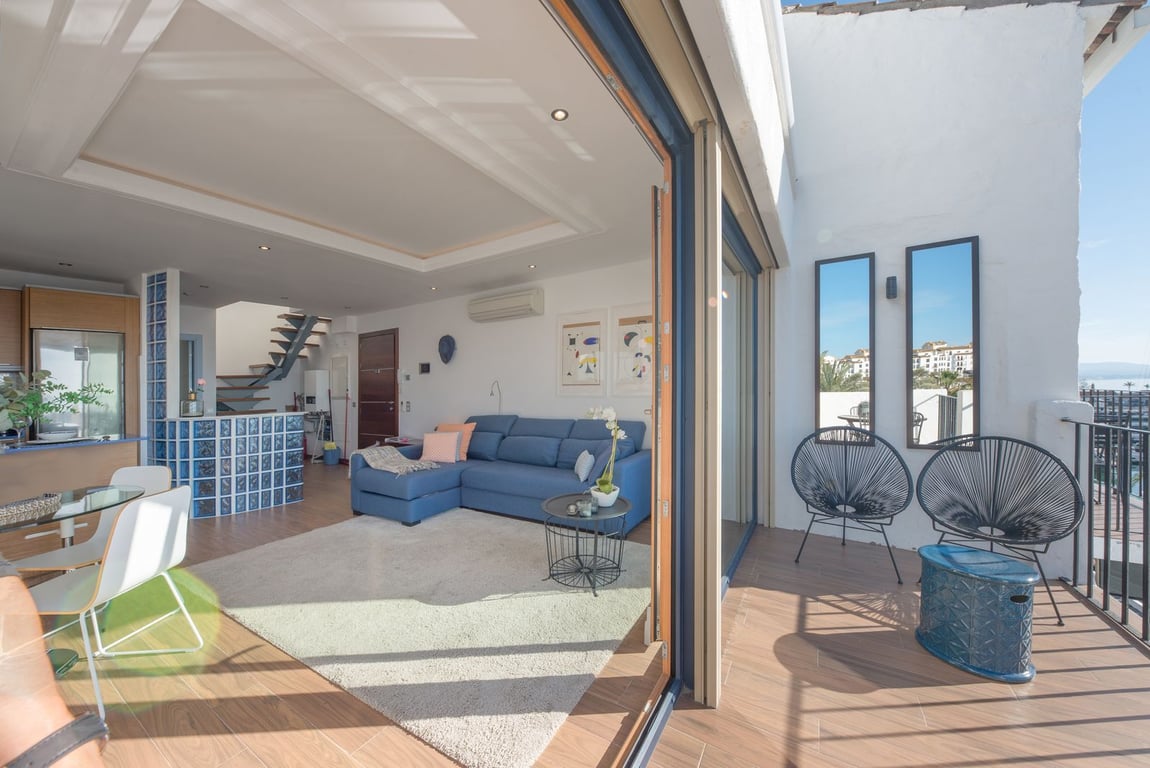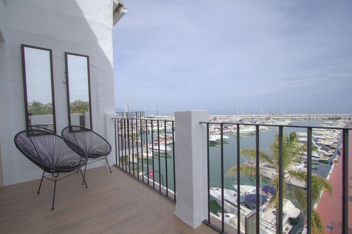 For Sale Puerto Banus Front Line duplex Penthouse with 2 terraces and panoramic sea views a popular holiday rental with rental income. 2 bedroom 1.5 baths Two terraces with outdoor seating Kitchenette Marina views with direct access Dozens of restaurants & shops within steps 100 meters to Playa Puerto Banus a holiday home in Marbella with rental potential Keys in the office