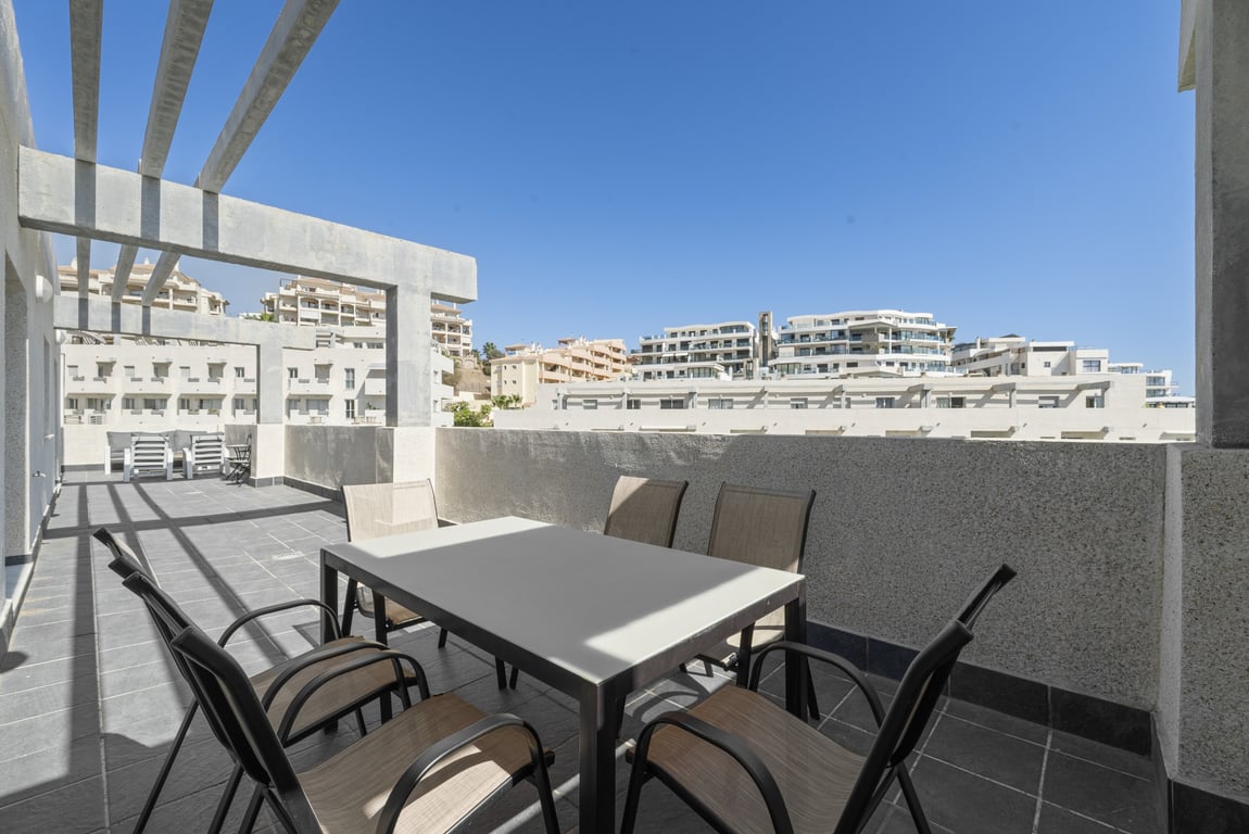 This elegant penthouse is situated in the sought-after upper Riviera del Sol, Mijas Costa, Malaga. Ideally positioned between Calanova Golf and Miraflores Golf, the property offers convenient access to the AP7 motorway, providing swift connections to both Malaga and Marbella. The apartment is located within a fully gated community, ensuring security and peace of mind for residents. The penthouse boasts a generous built area of 99.12m2 plus spacious terraces on both sides with outdoor dining are...